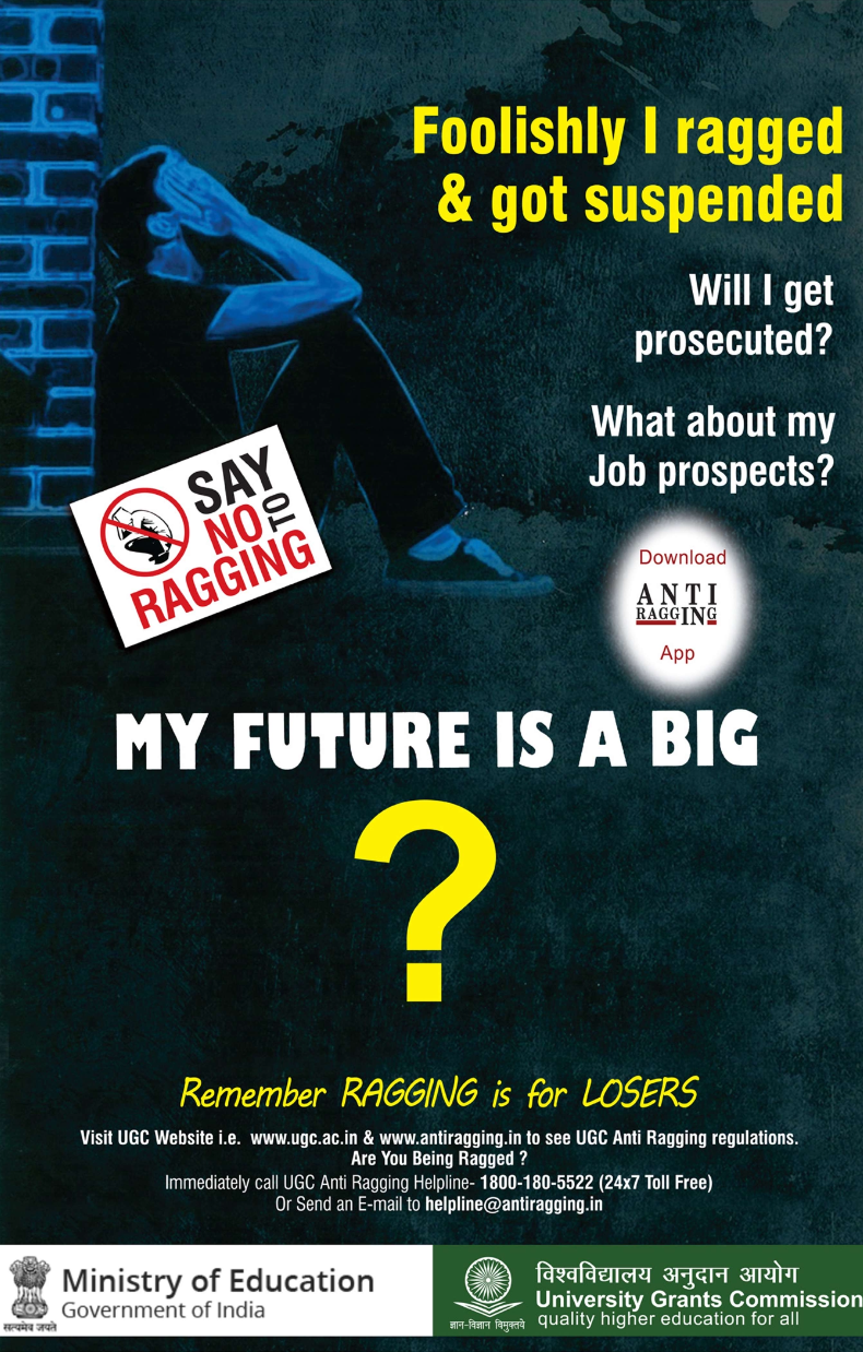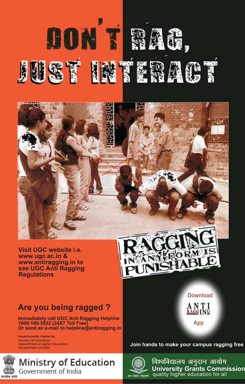 Ragging in any form—physical, psychological, or verbal—is a punishable offence and isstrictly prohibited on campus, in hostels, and during any college-related activities.